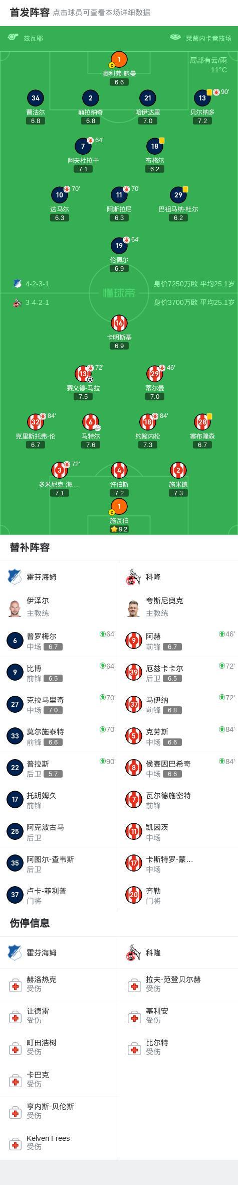 北京時間10月4日德國足球頂級聯賽 聯賽 第6輪,霍芬海姆主場對陣科隆。科隆賽義德-馬拉破門。最終比分霍芬海姆 0-1 科隆。